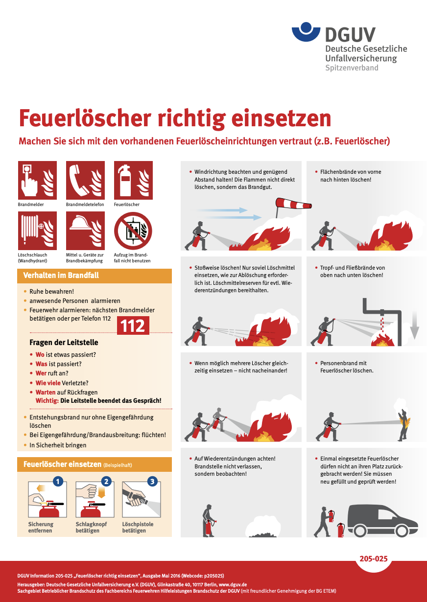 Für die Richtige Handhabung von Feuerlöschern im Brandfall hat die DGUV (Deutsche Gesetzliche Unfallversicherung) eine Übersicht erstellt: